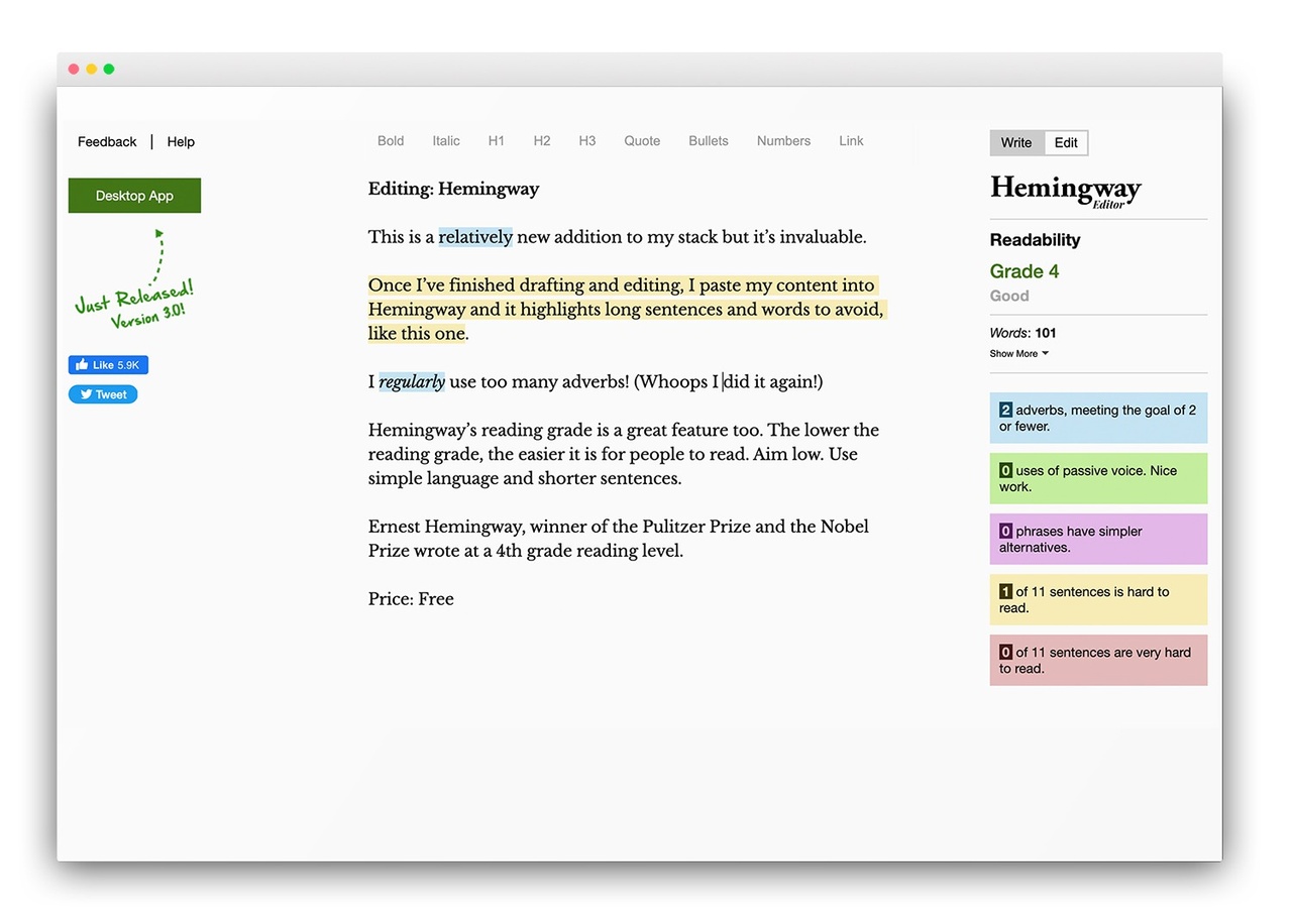 Hemingway’s reading grade is a great feature too. The lower the reading grade, the easier it is for people to read. Aim low. Use simple language and shorter sentences.